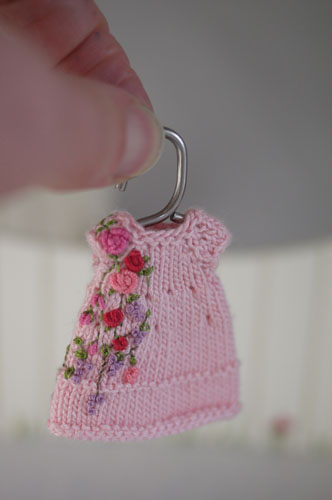 I’ve just completed this miniscule hand knit and embroidered dress for the Amelia Thimble doll.  I cannot wait for the lilacs and roses to bloom so I made them bloom early on this dress.