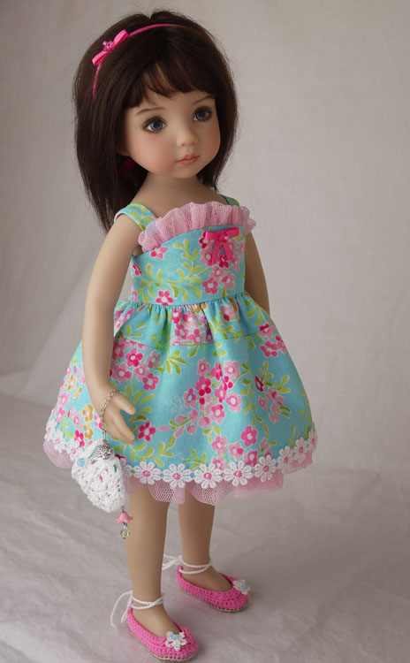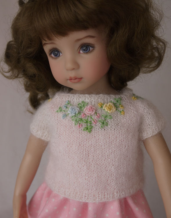 I’ve just completed this sweet cardigan for the Little Darlings. It is hand knit with super kid mohair/silk yarn and lavishly embroidered with bullion roses and rosebuds in little girl colors. I made it longer than usual so it can be worn with skirts and slacks, as well as dresses. This is a versatile sweater that will dress up many different pieces. The cardigan closes with genuine freshwater pearls. Nothing is too fine for these beautiful dolls.