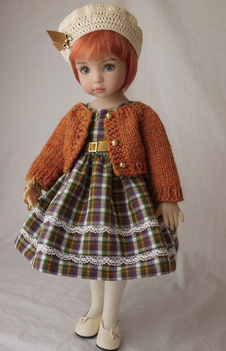 My Little Darling, Gina, is all ready for fall in her prettily colored plaid dress and crocheted beret. When the days start cooling off a bit she has a coordinating wool sweater to throw on for a bit of warmth. She especially wants to show you her new charm bracelet. She thinks that all of the different colored gemstone beads are so wonderful. For more information and additional pictures of this ensemble please visit cindyricedesigns.com.