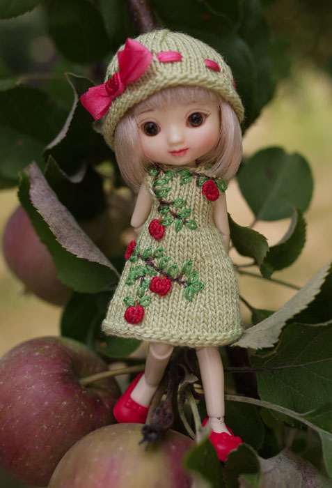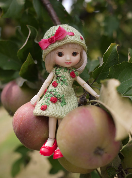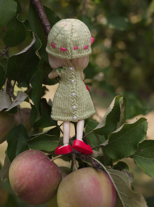 There’s been a lot of excitement over here having to do with our apple tree.  After six seasons living here (the tree is much older) we have apples.  Now they are not the most beautiful apples, but they are apples that we can actually eat.  Anyway, teeny tiny 4″ Amelia Thimble couldn’t contain the excitement in her bitsy doll body and wanted to experience the apple tree for herself.  She is such an agile little thing and held on tight the whole time.  I grabbed some pictures of her climbing amongst the apples. Thought I’d share these with you.  She looks quite proud of herself, doesn’t she?