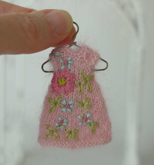 They love their super soft knitwear that I hand knit out of lace weight kid mohair/silk yarn in a shade of pink that reminds me of cotton candy. I hand embroidered little forget-me-nots in shades of floss to match the print in Patience’s dress. I gave Amelia an extra flower on her dress, my interpretation of the multi-petaled mum like pink flower. They are happy girls, can you tell?
