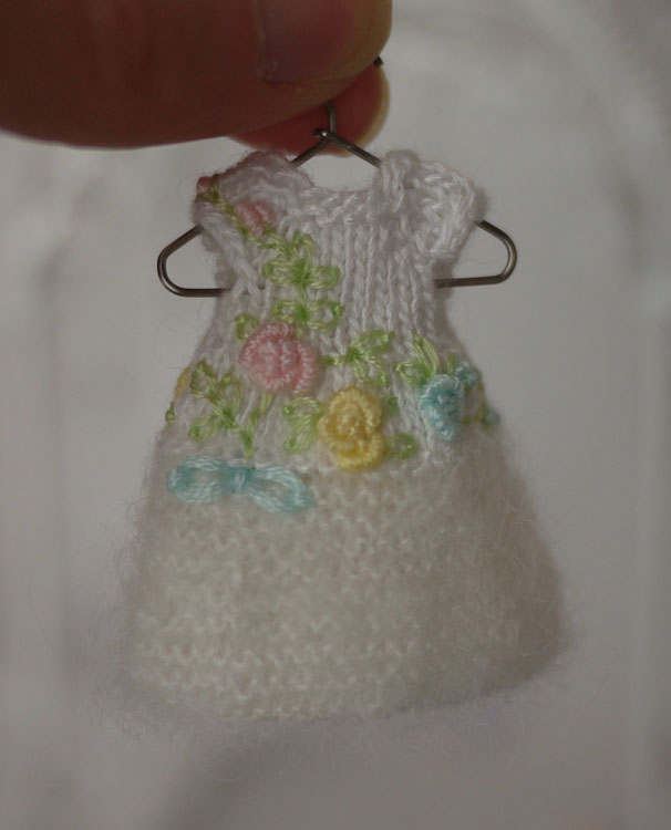 I was inspired by those cute little party dresses with the poofy feather skirts that you see everywhere these days. I didn’t want to use feathers though for tiny Amelia. This super kid mohair lace weight yarn seemed like it might give the effect I wanted and it did knit in garter stitch. I had matching bamboo and mohair in white and pink so made a party dress out of each. I love how frilly and delicate these dresses are. They are the perfect winter party dresses.