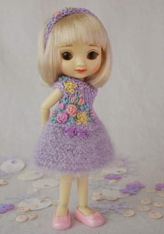 Lately I have been very busy knitting and embroidering for tiny Amelia Thimble.  She has had quite a busy year modeling for me.  Too busy, in fact.  Poor Amelia is quite exhausted.  I had to do something for her.  Last week I hired another model, Izzy, to help out Amelia.  Soon you will see Izzy modeling my little dresses too.  Not only is Amelia happy to have help with modeling, she is thrilled to have a new friend who is just like her.