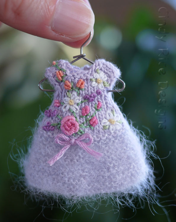 Amelia Thimble and Izzy have new party dresses! Each dress/hat set is hand knit with bamboo yarn and mohair/silk lace yarn. You will find a sweet and colorful collection of flowers embroidered on the bodice and headband of each set.