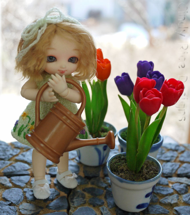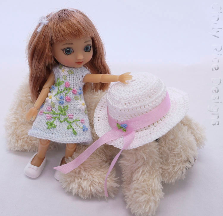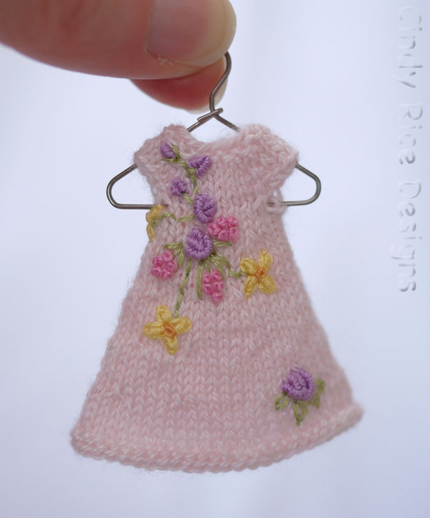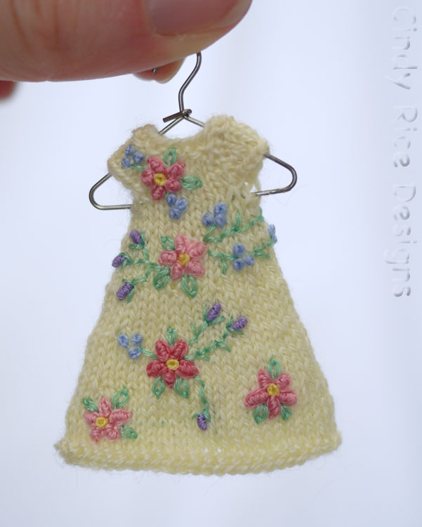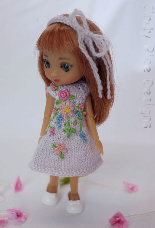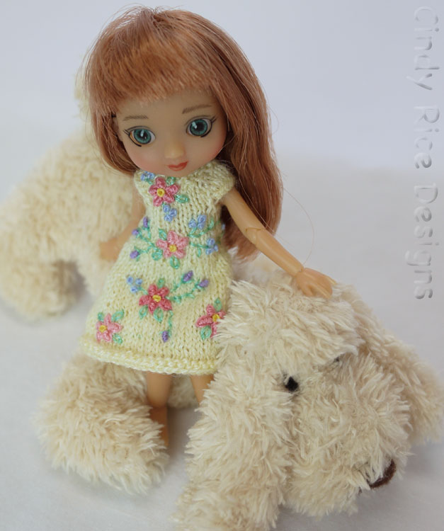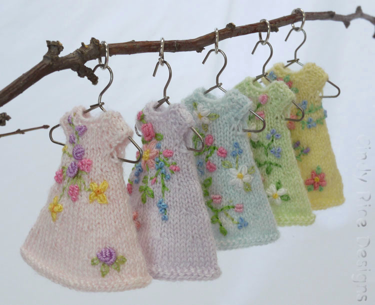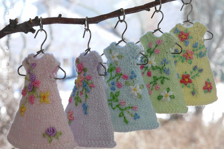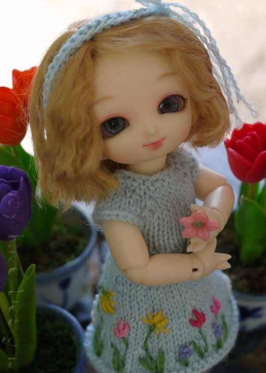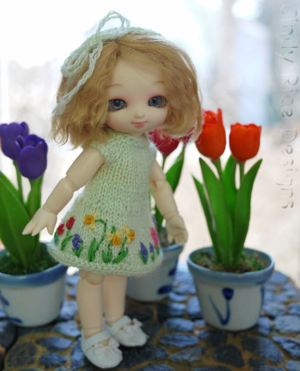 Soon our spring bulbs will start to bloom here in northern Illinois. Pukipuki has gotten a head start on her gardens. They are blooming along the hemline of her mint green and sky blue knit dresses. Teeny tiny daffodils, tulips, hyacinths, and grape hyacinths are everlastingly in their glory on these dresses.