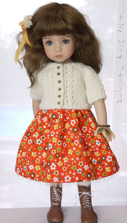 My Little Darling, Gina, sure is. Here she is modeling her new one-of-a-kind fall dress and sweater set. I’ve had this wool/angora yarn for a few months and finally got to use it for this fall ensemble. The sweater is so soft and warm I wish I could wear it. Vertical lace panels decorate the sleeves, front edges, and the back; bronze Czech glass beads button up this cozy sweater. The dress is a pumpkin color cotton print with lots of wonderful colors used for the flowers and dots. The dress features a lacy panel on the bodice and a frilly tulle ruffle at the hemline. The dress is entirely lined in white cotton lawn with all of the seams hidden between the lining and fabric; the lining is also invisibly hand stitched.