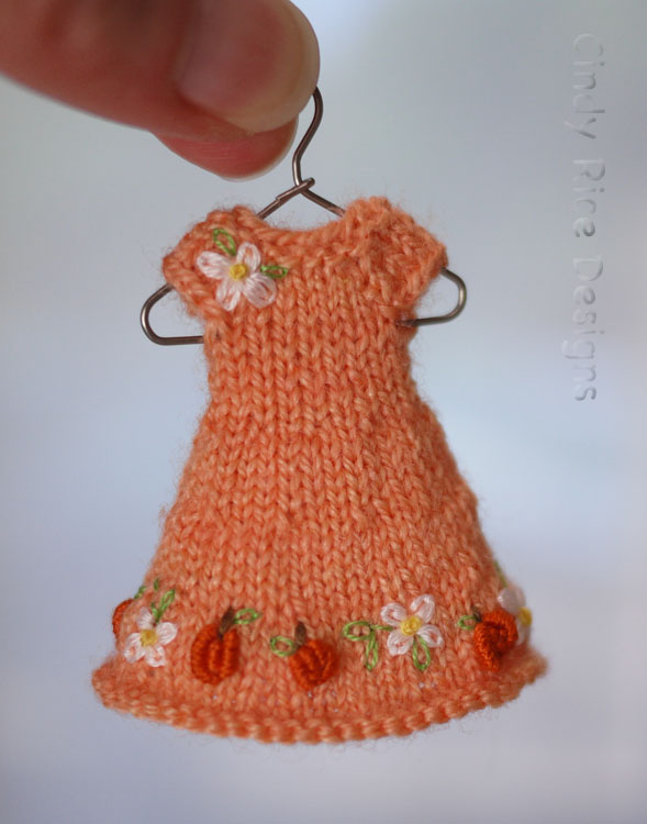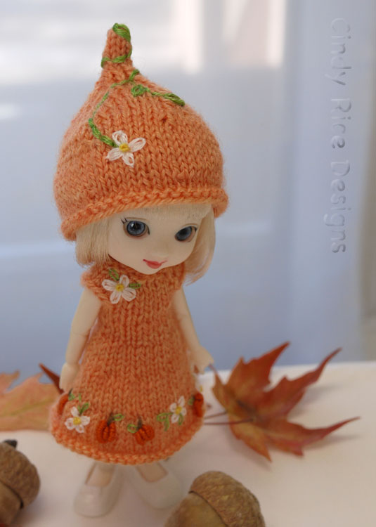 Well, fall is officially here.  Bring on the fall colors!  Here is Amelia Thimble modeling her new fall dress/hat set for you.  It is knit in a hand dyed light shade of pumpkin and hand embroidered with teeny tiny bullion stitched pumpkins, white blossoms, and greenery.  Oh, and every pumpkin needs a perfect little stem.  Amelia’s cap is pumpkin shaped and decorated with more embroidery.