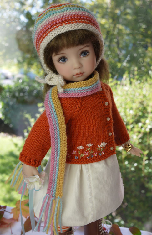 This new 8-piece ensemble called “A Toasty Warm Autumn” will keep every Little Darling who lives in a cooler climate cozy and warm throughout the fall months.  The hand knitwear (sweater, hat, scarf) are all made with Peruvian Highland wool.  The sweater is a bit longer length and the hat has cute ear flaps for those chilly brisk days.  I found that when I keep my neck warm I stay warm so I made a generous scarf to wrap around the Little Darlings neck to help her stay warm too.