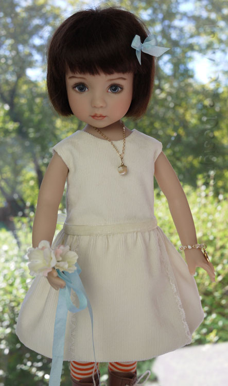 Even though it is fall, if you look closely enough you might still be able to find a few blossoms blooming.  Gina made a small bouquet with the blossoms she found.  A pretty blue silk bow is attached to the bouquet along with an elastic cord to help the Little Darlings hold it in their cute little hands.