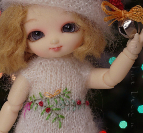 So to welcome the season here is my Pukipuki Sugar. She is wearing a winter white hand knit and daintily embroidered dress in a mohair/silk yarn. On her head is a ruby red Santa hat with fuzzy trim. If you listen closely you can hear the tinkling of the little bell which magically sticks to her hand (oops sorry, no magic here, there are magnets in Pukipuki’s hands).