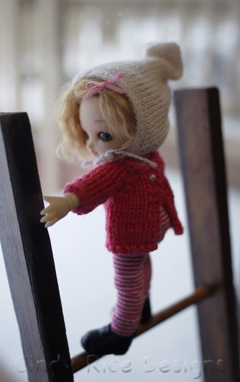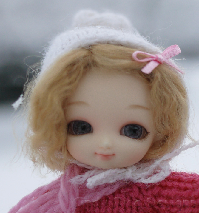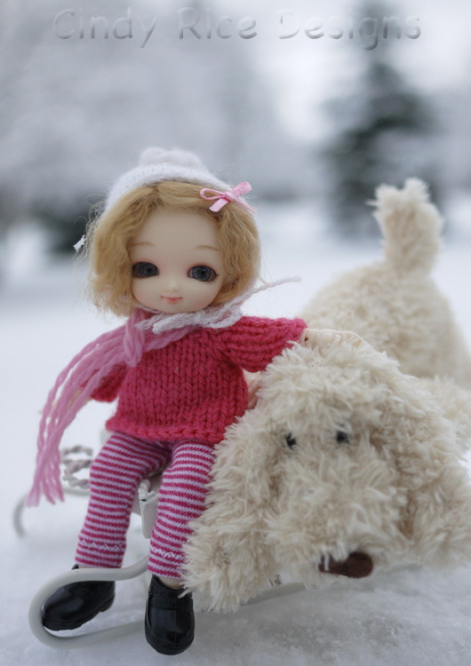 Sugar (Fairyland Pukipuki) has never felt snow. I know, it’s my fault. She hasn’t had proper winter clothing. However, last week I knit her a bulky wool sweater which will keep her nice and warm. She’s got some waterproof boots and leggings too. She donned her winter gear and begged me to take her out on the sled. She needed a few extra pieces so I found some scrap yarn to wrap around her neck as a scarf and dug out her little pixie hat to keep her ears warm. I think she’s ready to experience snow.