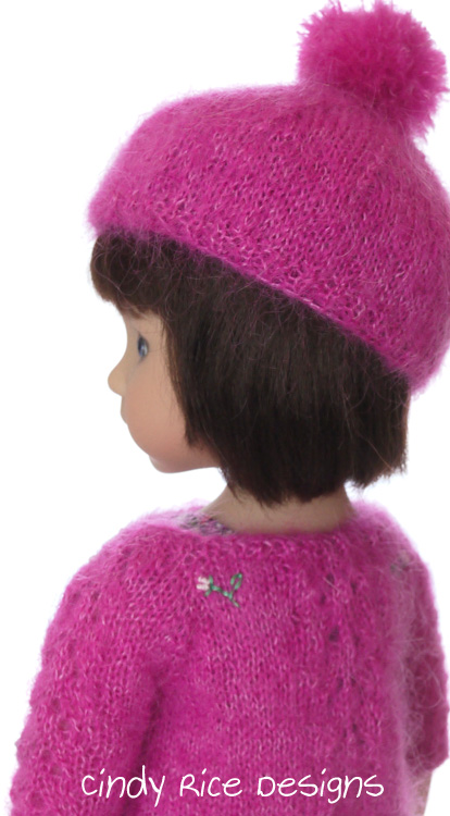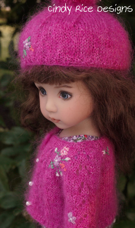 Oh Cindy, this is just like candy…it looks good enough to eat! It is B-E-A-U-T-I-F-U-L!!! I’m assuming that is magenta in real life? It looks wonderful on Gina…in either blonde or brunette wigs! She’s a little doll! Your knitting is superb and those little flowers are really something. I bet it’s as light as a feather, isn’t it?