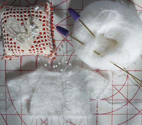 Later on the sun came out and cast some shadows onto my newly knitted Little Darling sweater drying on the blocking board.
