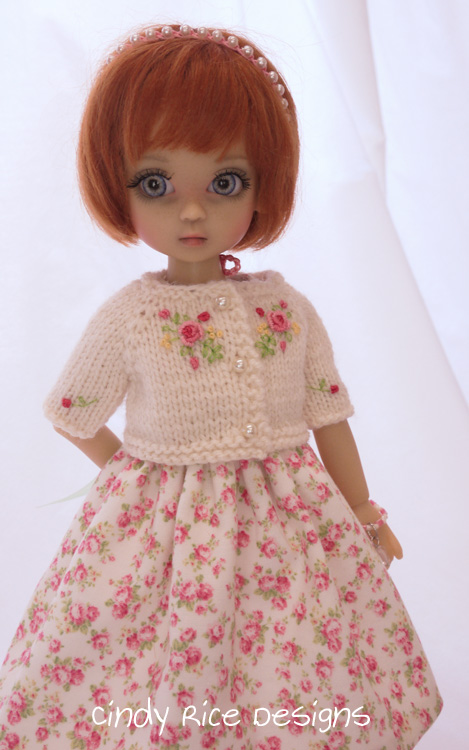 It is so rewarding that I can make roses bloom in my studio whenever I wish. This past week I made Kaye Wiggs Millie this very rosy ensemble. Not only is Millie a smaller BJD she is also petite so this small rose print worked perfectly for her. Her cardigan is wooly and warm, but is also colorful, and sure to brighten up your world.