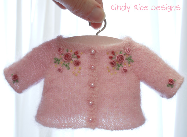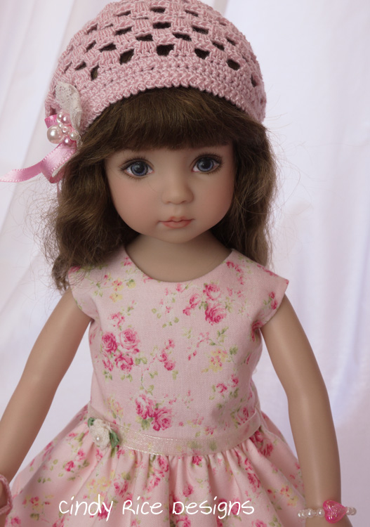 I use pink for my doll ensembles SO much, but I think this new set for the Little Darlings is the pink-iest to date. I made the crocheted hat and purse to originally go with her last outfit see here, but as sometimes happens, it just didn’t “work”. I often ask my daughter’s opinion and she agreed with me and added that these two pieces looked a bit like 1920s fashions and suggested a drop waist styled dress. Originally, I thought a white dress, but then I got in a new order of fabric and saw that this pink floral rose print would be so much prettier than white, and, although this outfit looks sweet without a sweater, a super soft light as a feather pink mohair is the icing on the cake to finish off this decadent delight.
