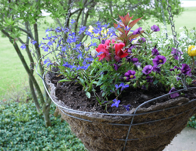 My husband and daughter secretly bought flowers and planted a large planter and two hanging baskets for me. They are so sweet. They remembered my absolute favorite flower for planters as well, lobelias. I love these tiny trailing flowers so much. Lobelias are the white and dark purple tiny blossoms. They also planted trailing tiny petunias, moss roses, and snapdragons in a rainbow of colors.