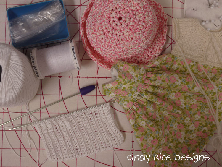 And today, I embroidered the cardigan. Any guesses as to who this is for? (The piece of lace knitting doesn’t go with the dress, hat, or cardigan set.)