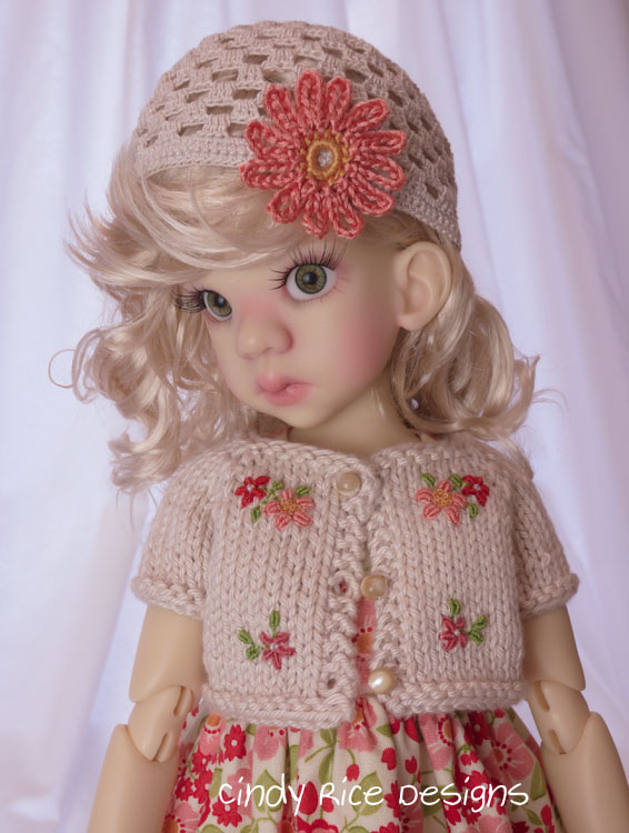 I knit Talyssa’s cardigan in natural colored cotton/Modal yarn, so I could use all of the beautiful color in the fabric for the embroidery. Bullion stitched petaled flowers in three shades of coral, colonial knot golden centers, tiny opalescent seed beads, and kiwi green bullion stitched leaves create the artwork for the sweater; mother-of-pearl beads make the perfect buttons.
