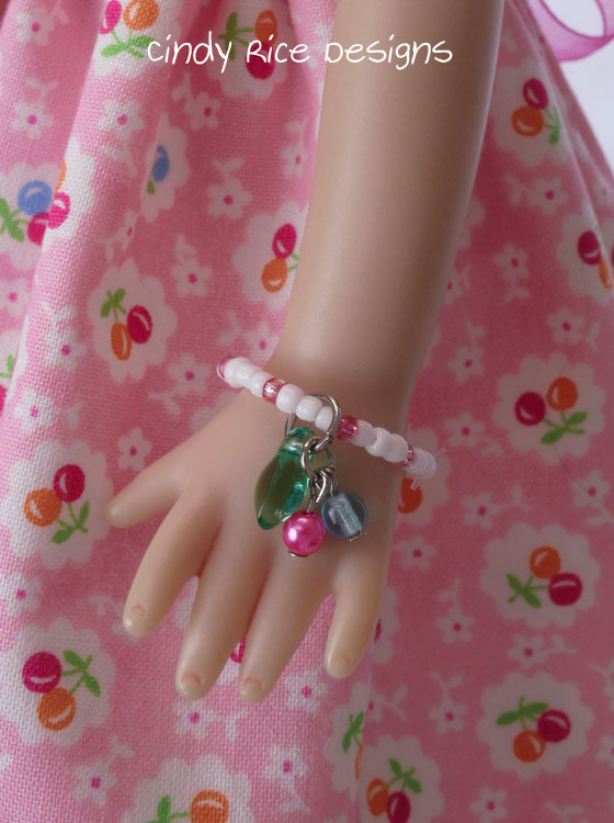 I found beads to mimic the magenta and blue bunches of fruit, so I made a little fruit charm for the bracelet.
