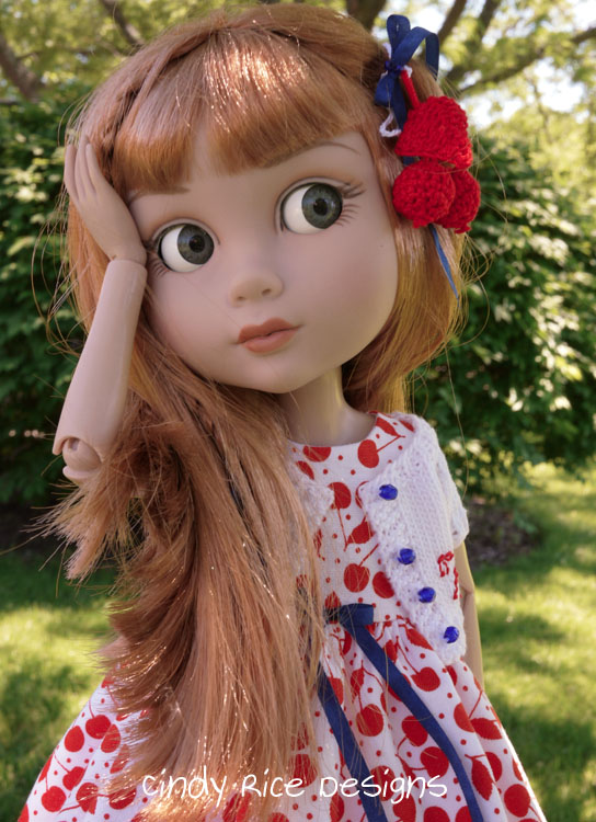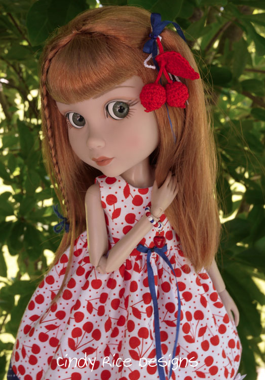 I crafted a fun hair tie to bring to life the cherry motifs on Patience’s dress. I crocheted around lightweight pearl beads so the cherries would hold their shape, added a crocheted leaf, stems with the crochet thread, navy silk bow and a length of fine crochet to use as the tie. Patience seems to be enchanted.