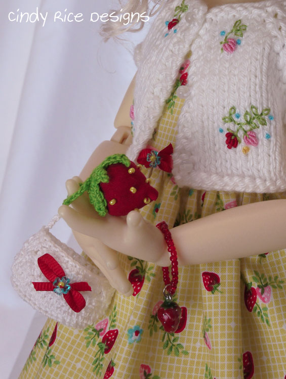 strawberry picking 822It was fun creating the little accessories to go with this set.  The little strawberry is a mini stuffy with beads and a crocheted top.  Talyssa can hold the berry by the loop.  The crocheted basket will hold the strawberry too.  I had the strawberry charm in my bead drawer waiting for the perfect fabric.  Those little aqua bead blossoms matched the blossoms on the fabric oh, so nicely.