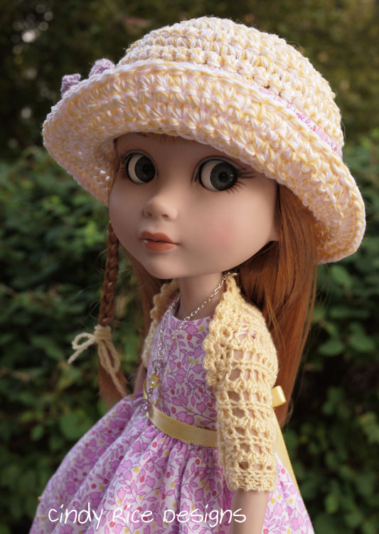I love Patience in hats.  This one is crocheted with three strands of cotton in two different weights of thread.  The brim can be turned up, down, or a bit of both.  The band matches the dress.  I “free hand” crocheted (no pattern) the flower to coordinate with the shapes on the dress.  It is a cup shape and filled with yellow beads for the stamens and has a curly apple green stem.