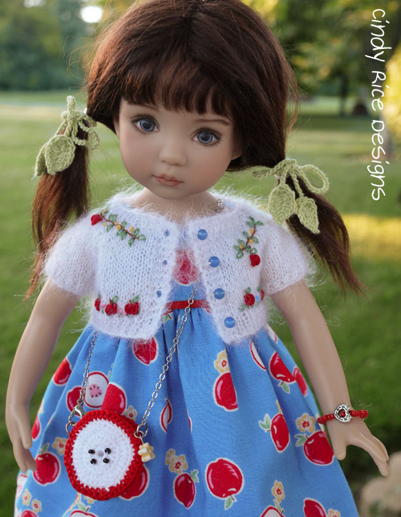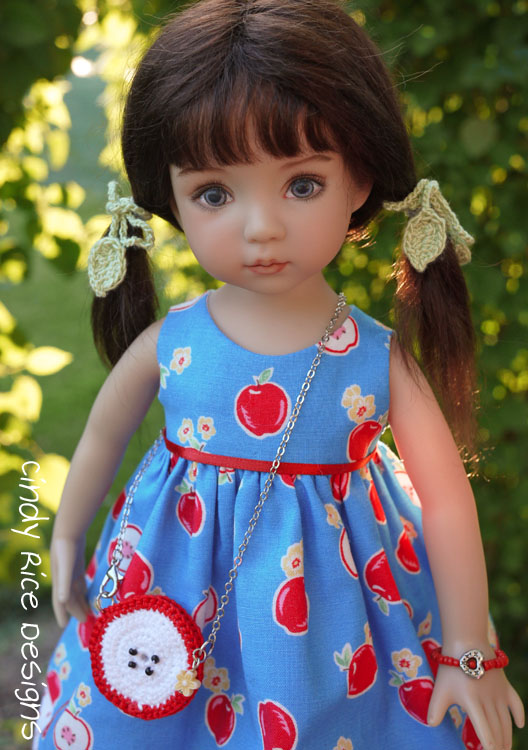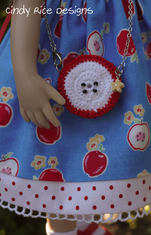 It was fun creating her little apple slice crocheted purse. She can slip little found treasures inside too. I was thrilled to find a little bead in my stash that matched the blossoms on the dress’s print!