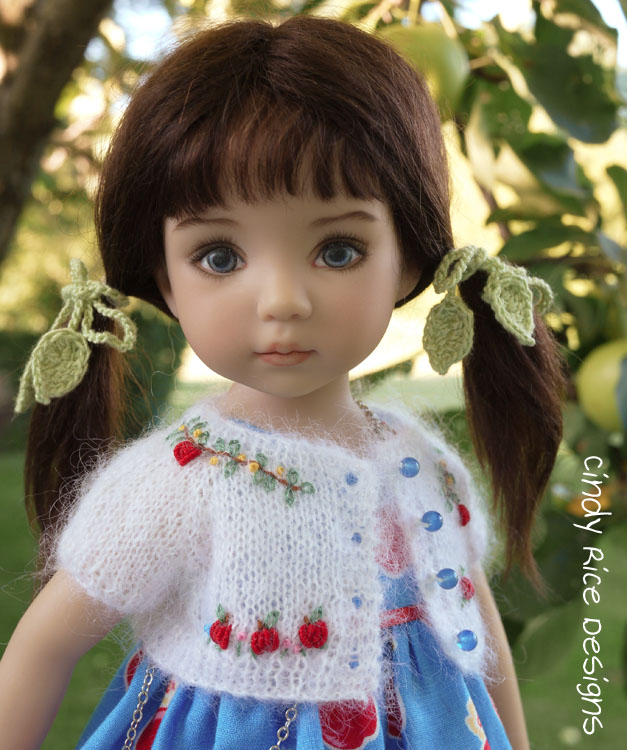 Gina’s little cardigan is knit with lace weight mohair/silk yarn. Tiny apples hanging from branches and apples lying in the grass amongst coordinating colored colonial knot blossoms are embroidered in a fun and cute composition on the sweater. I even put a tiny apple motif on the back.