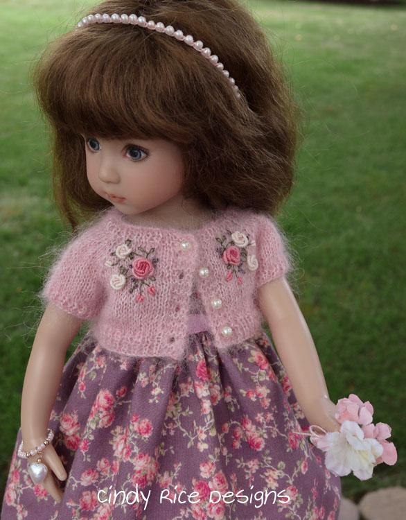 pink 'n plum 306Gina’s hand knit cardigan is made with lace weight mohair/silk yarn to produce a sweater that is oh, so soft and light as a feather.  The bullion stitched rose bouquet motifs are mirrored which gives a more formal feel to this tiny piece.pink 'n plum 302