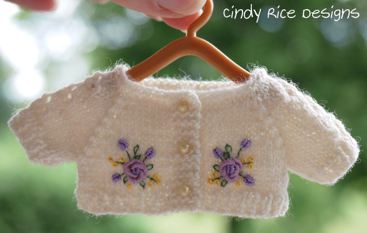 Millie’s hand knit accessories (beret and scarf) are made in a beautiful grape colored heathered merino lace weight yarn. Her cardigan is in the same type of yarn, but in a natural color.