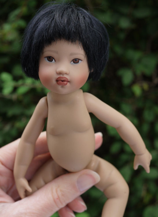 Kish Tamsin is one of Helen’s bent leg vinyl babies who fit nicely with the 14″ Chrysalis girls. She was very attached to Song (who is up for adoption now) and spent her time in Song’s lap while living with me. Wish I had a photo to show you of the two of them together, they were so cute.