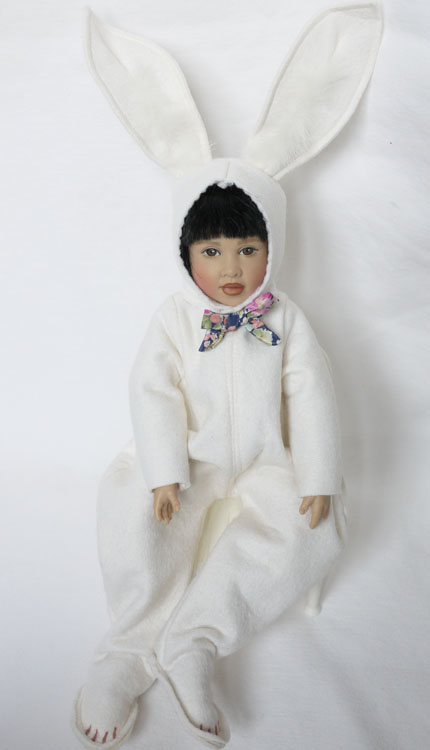 My last doll that I am putting up for adoption this week is the only doll that I have ever bought from a local doll shop, long since closed; all my other dolls have been purchased online. It is funny, but when I purchased her I had no idea what her body would be like underneath that rabbit costume. The costume was stuffed with fiberfill and it looked like she was a stuffie with a vinyl head and hands, but I bought her anyway. She is the 12-1/2″ White Rabbit doll, companion to the 16″ Alice in Wonderland from 1996. Now that I have read Helen Kish: The Artist and Her Dolls by Louise Fecher, I know that The White Rabbit is part of Helen’s first multi-jointed vinyl dolls and is the Jesse sculpt (a boy doll). I made a few dresses for this doll, but mainly used her (or him) as the Easter Bunny for the Riley and friends line. Oh, Kish and Company graciously restrung her for me a while back, so her elastic is nice and fresh.