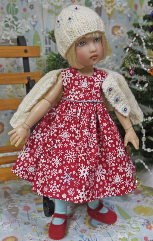 I made two Christmas ensembles for Kish Bethany in 2012. This first one is more formal than the one my blonde Bethany is wearing. I think that this was probably the first sweater I made out of the mohair/silk lace yarn that I use so much now.