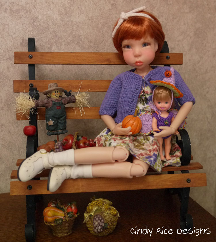09-28-25 314Kish’s Alisha and Tonner’s Lilah (Ann Estelle’s little sister) are dressed for fall.  I kept teddy on the rocking chair, but put away the spring hats and gave him a few pumpkins.