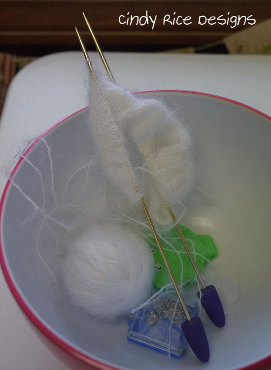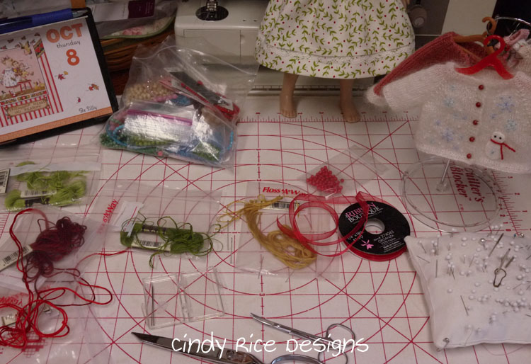 Yesterday was a fairly successful day. I put the finishing touches on Sugar’s first Christmas set, completed the embroidery on Gina’s mohair Christmas sweater, completed the Santa hat to accompany the mohair sweater, and worked a bit more knitting Millie’s mohair Christmas sweater.