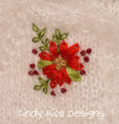 Yesterday I got a few things finished.  Do you remember the sweater that I showed you with the embroidered poinsettia?  That ensemble is all completed!  I crocheted a little Christmas stocking to go with it too, so fun.  I need to get photos taken… here’s the poinsettia embroidery on the sweater again.