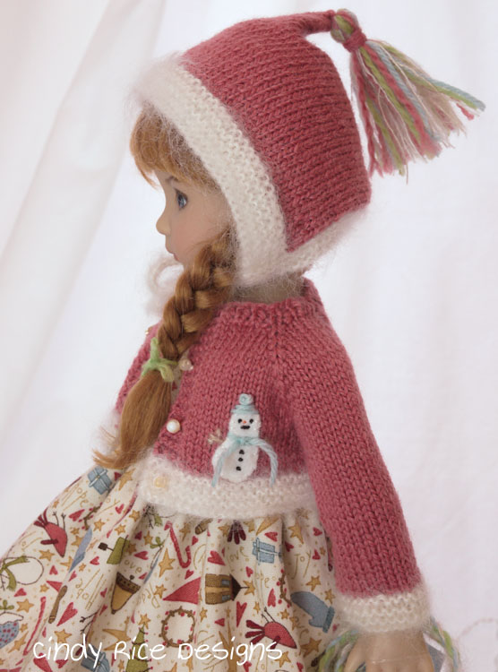 I had the perfect shade of wool yarn for knitting the sweater and hat.  It matches the rosy color beautifully.  I picked out the blue and green in the print and added bits of those colors throughout the ensemble for extra “colorfulness”.