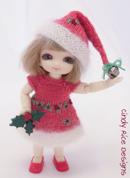 Her Christmas set is knit with hand dyed merino lace weight yarn. It photographed brighter and pinker than it actually is, it is a muted berry color. The “fur” trim is knit with mohair/silk lace yarn. I attached little strips of magnets to the back side of the plastic holly charm, so Sugar can hold on to it.