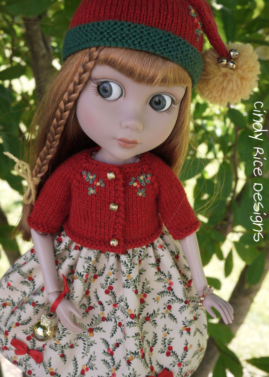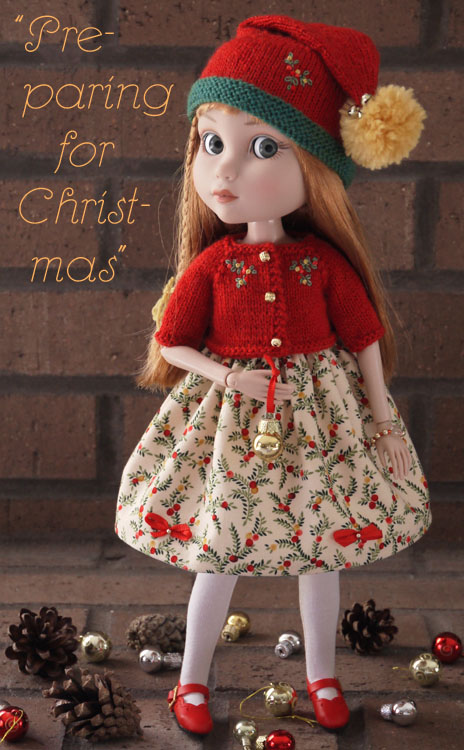 preparing for christmas 802I guess I’ve been hoarding this Christmas fat quarter cotton print.  I’ve had it for years and was inspired to make an ensemble with it this year.  The evergreen boughs and ornaments/berries are colorful in a warm and cozy way.  I added lots of shiny golden accents to accentuate the golden yellow berries and the light golden background.  There are quite a few shades of red in this print; perfect for adding red knitwear and two colors of berries to the sweater and hat embroidery.  And, of course, I had to add some pine green for Christmas.