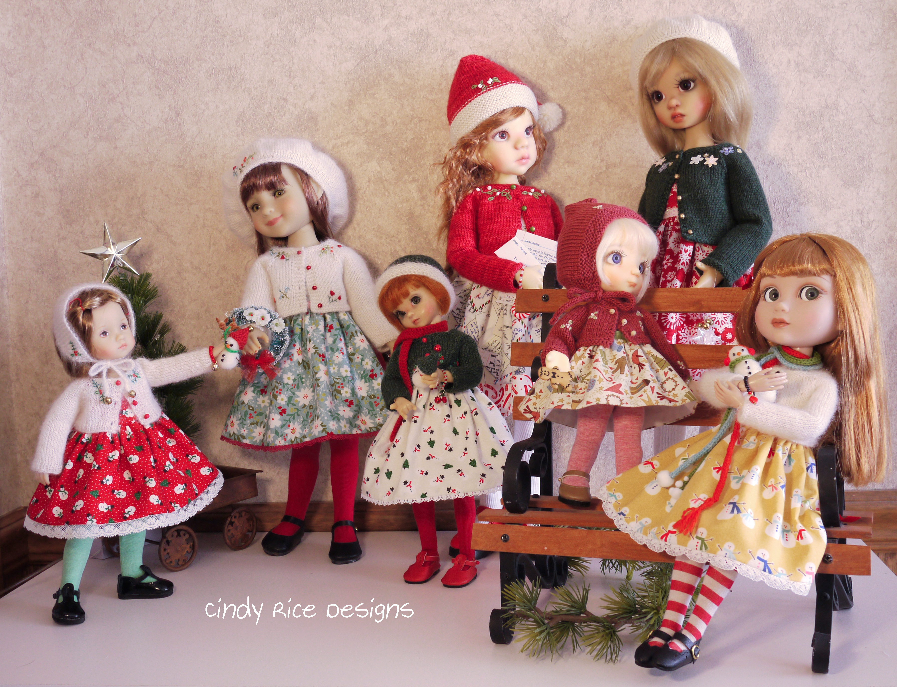 My doll room has been a busy place this season. Everyone you see with the exception of Millie is wearing a new holiday ensemble.