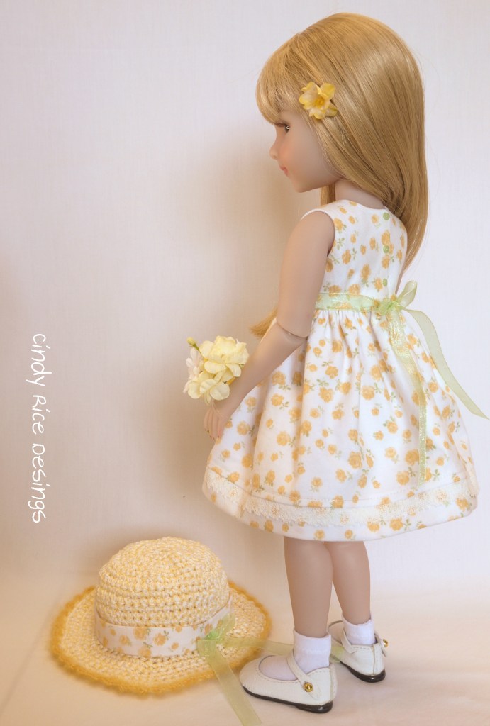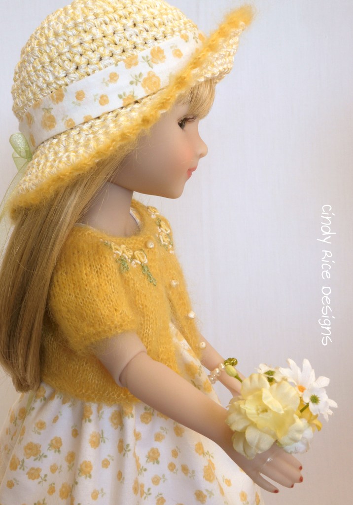 *Holly’s beautiful sun hat is crocheted with three strands of cotton crochet thread. The brim can be turned up or kept straight. The shell edging is of the same yarn as used for the cardigan. A band is made with the dress fabric and attached by hand stitches at the back. A matching green organza ribbon decorates the back of the hat. Organza ribbon edges are treated to prevent fraying.