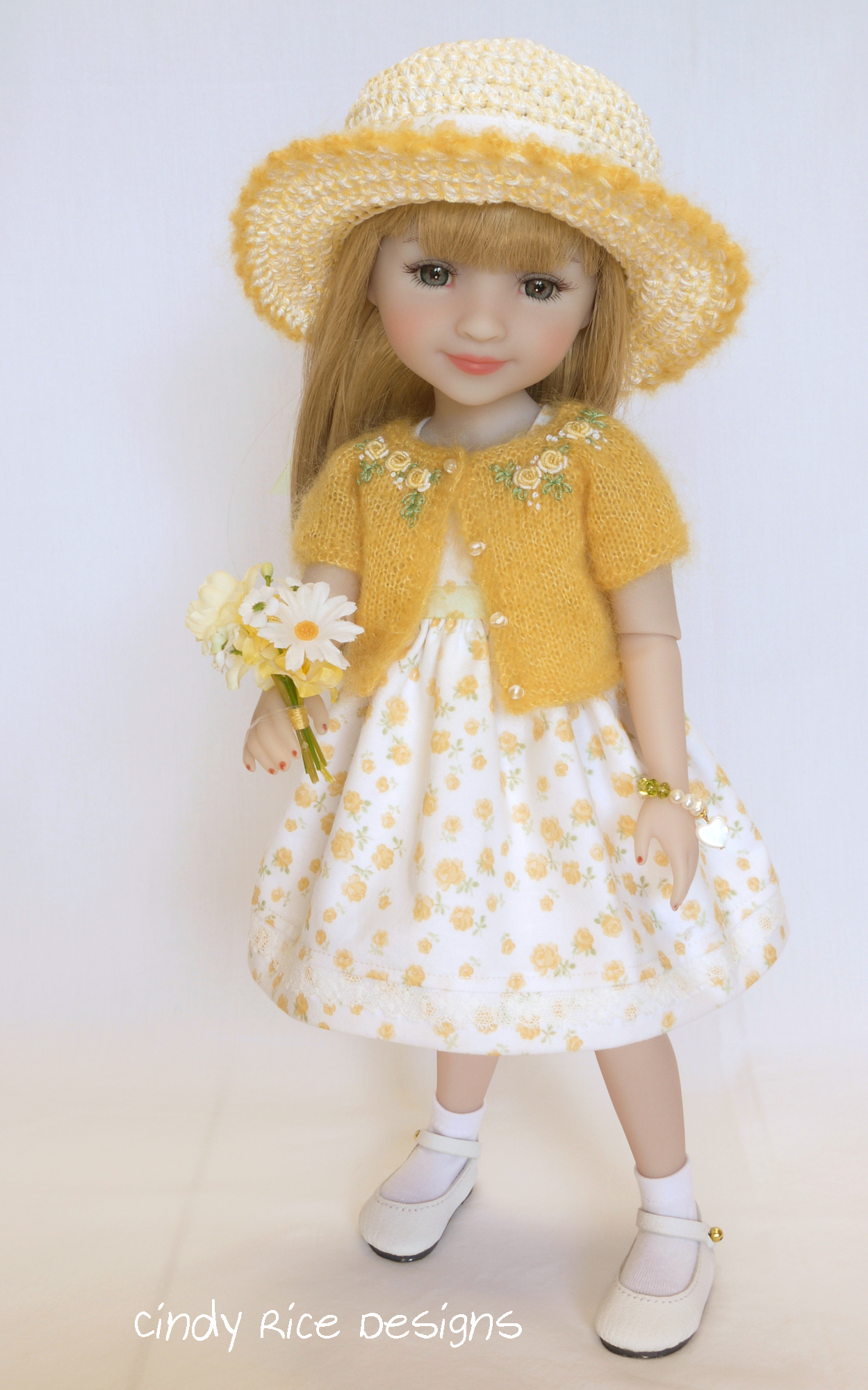 *Hand knit mohair/silk short sleeve golden yellow cardigan is as ‘light as a feather’. Embroidery to coordinate with the dress–sunshine colored roses, fresh green leaves, and buds are hand embroidered along the front neckline. Cardigan closes with ivory mother-or-pearl button beads.