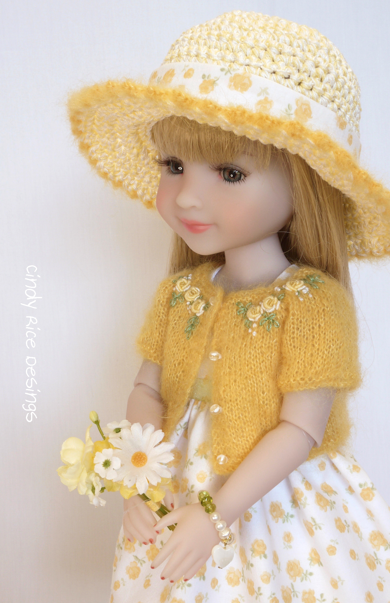 *Holly’s beautiful sun hat is crocheted with three strands of cotton crochet thread. The brim can be turned up or kept straight. The shell edging is of the same yarn as used for the cardigan. A band is made with the dress fabric and attached by hand stitches at the back. A matching green organza ribbon decorates the back of the hat. Organza ribbon edges are treated to prevent fraying.