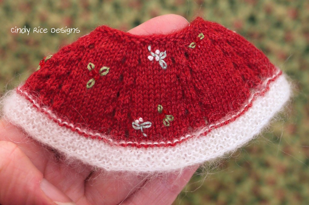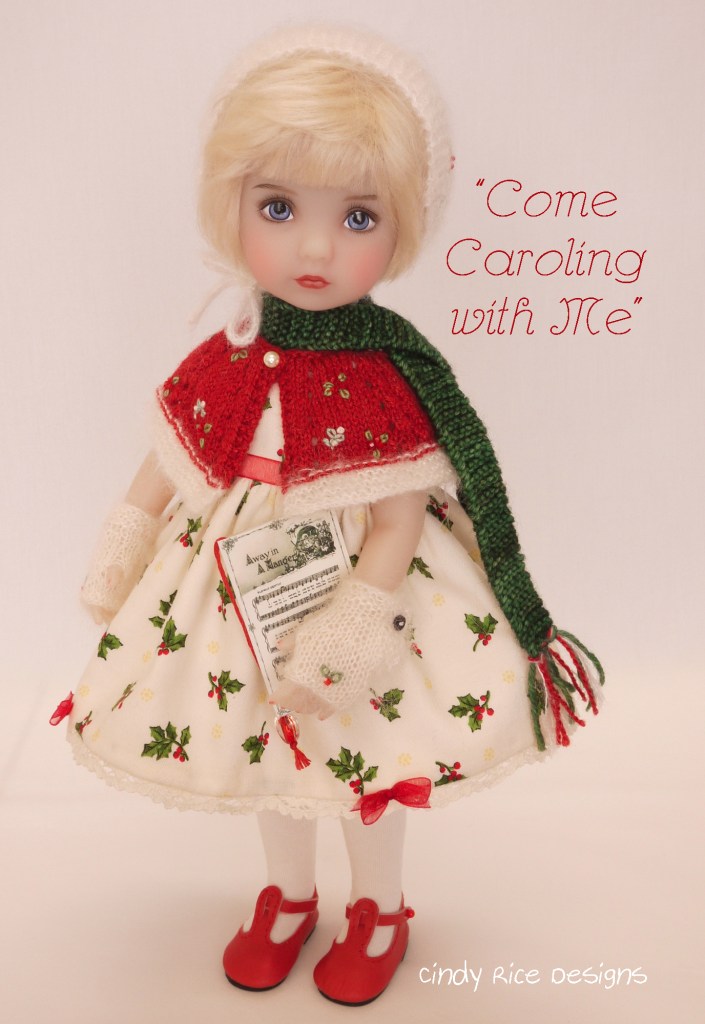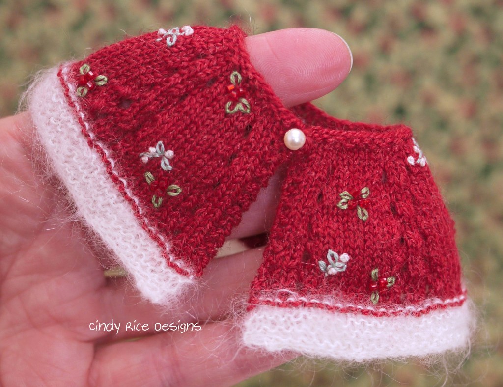 *Evianna’s fingerless mitts keep her hands toasty while she holds her caroling music. They are knit with the mohair/silk and sweetly embroidered with holly. They open with a metal snap (covered with a black button) for ease in dressing.