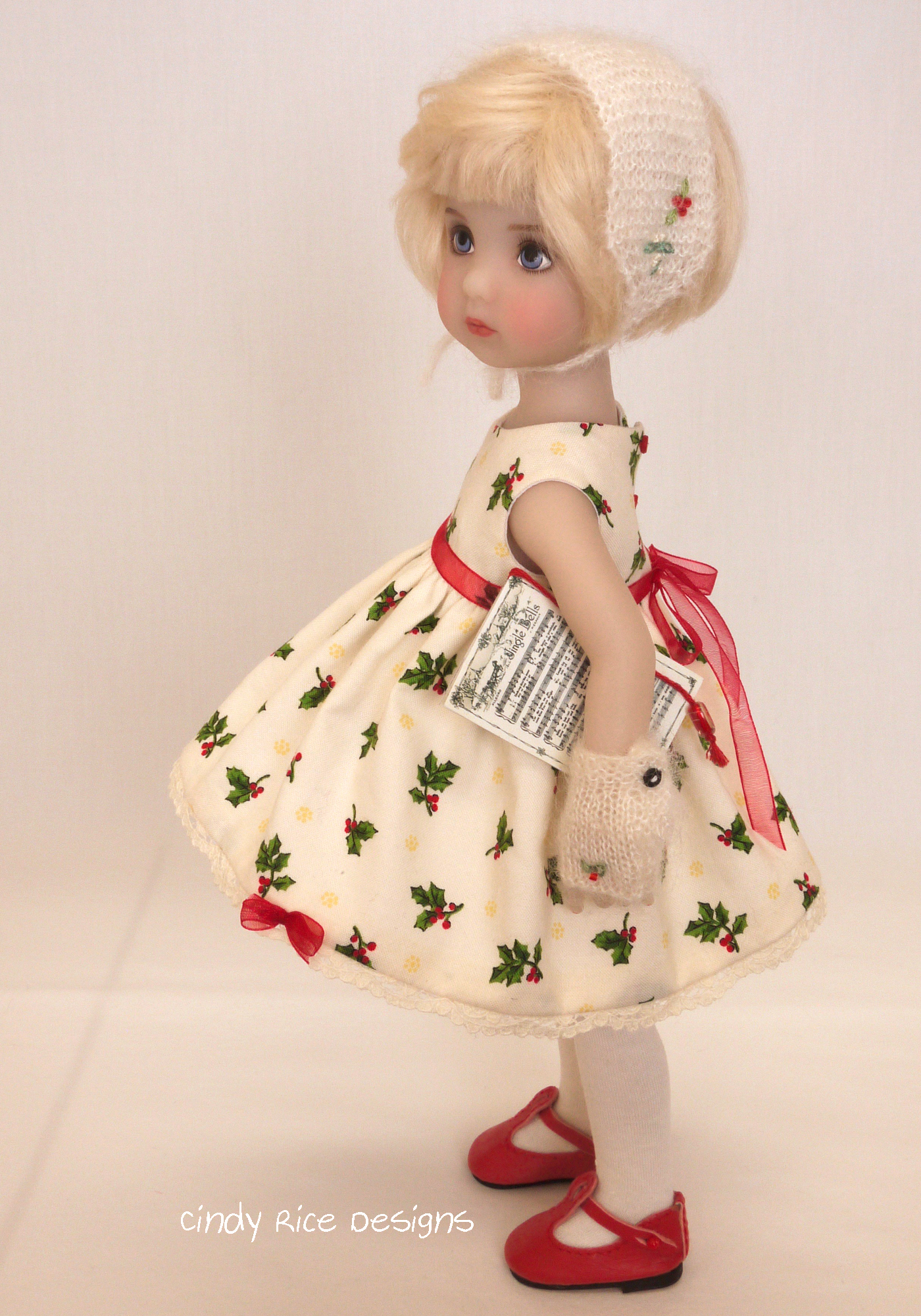 *Fully lined (with lightweight cotton lawn) holly print dress. All of the raw edges are completely encased between the lining and outer fabric. The traditionally depicted sprays of holly are scattered on an off white ground. A red organza ribbon (held in place with thread belt loops, ends treated to prevent fraying) tied around the waistline and tiny red buttons are on the back. Closes with hand sewn metal snaps. Scalloped cotton English Cluny lace decorates the hemline of the skirt along with two hand made organza bows which are carefully attached with thread.