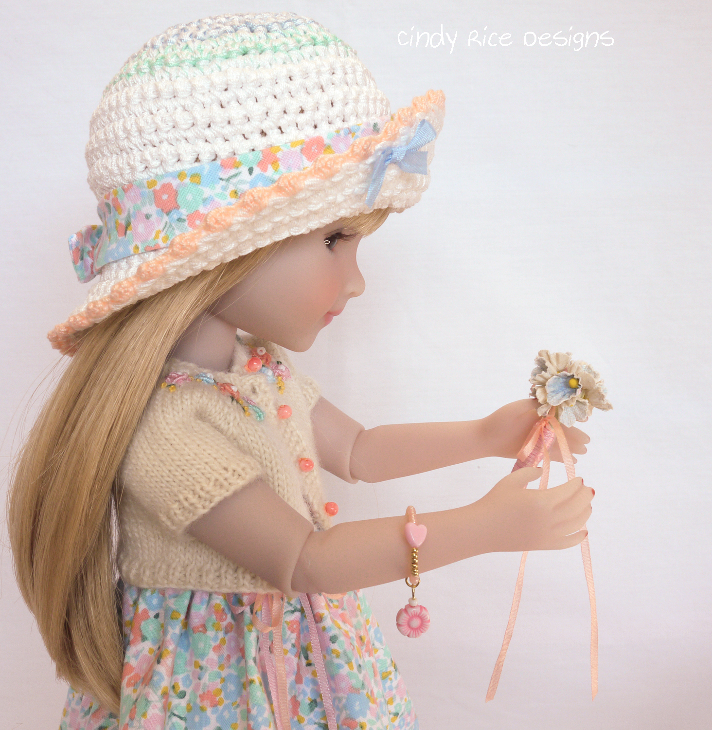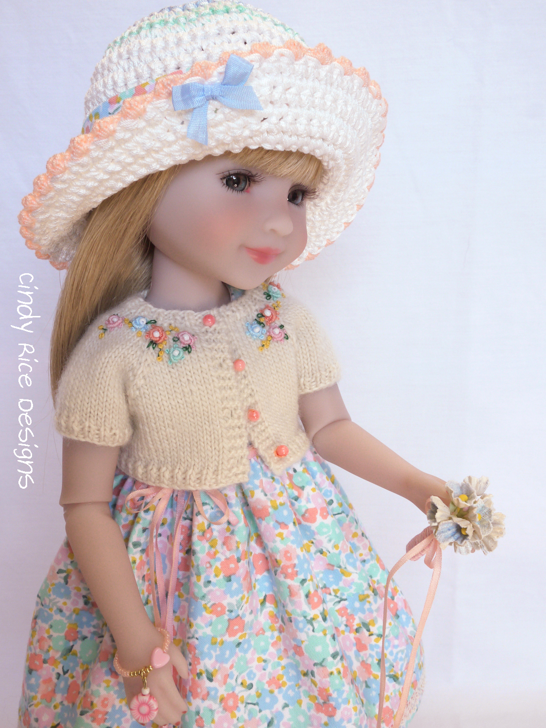 As spring is drawing to a close I am starting to gravitate towards summery prints for my doll ensembles. Bella, my Ruby Red Fashion Friend, is the first recipient of a summer ensemble this year. She wears a simple floral cotton dress with cotton crocheted ballet slippers (on her bare feet) and a cotton crocheted sunhat. Summery blue and red are a part of her new look. When I was very young I remember loving to wear these colors in the summertime. There is a tiny bit of pink in this print, too–can’t ignore pink!