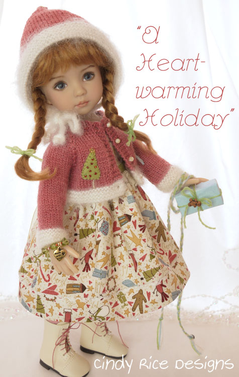 Doesn’t Penny look warm dressed in “Homespun Holiday”? She wears a wooly cardigan and pixie hat along with rosy heather tights. The dress is sewn with one of my favorite holiday prints, “Under the Mistletoe” by Anni Downs of Hatched & Patched. I love the many primitive motifs and the palette of muted colors the designer used in this print. In 2015 I used this same fabric to make my Little Darling, Gina, a holiday ensemble. Here is a link to that ensemble’s post if you’d like to see more photos. Even though this fabric is probably impossible to find now Anni has a Christmas collection coming out in May which looks like there might be some cute prints included in it. Also, more pictures of her fabric here.