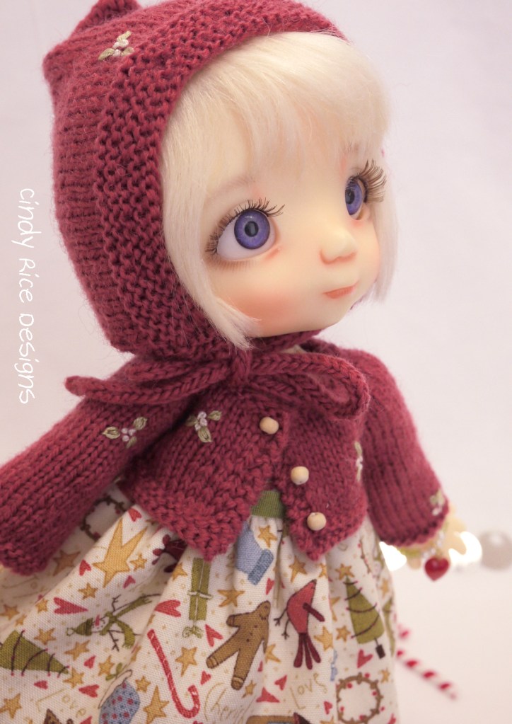 Penny (by Linda Macario) is wrapping up the year by showing you her holiday ensemble, my last make of the year. She is dressed warm and snuggly, and a good thing, too; we have snow coming tomorrow–the first measurable of the season. We’ve all been waiting… It will be magical!