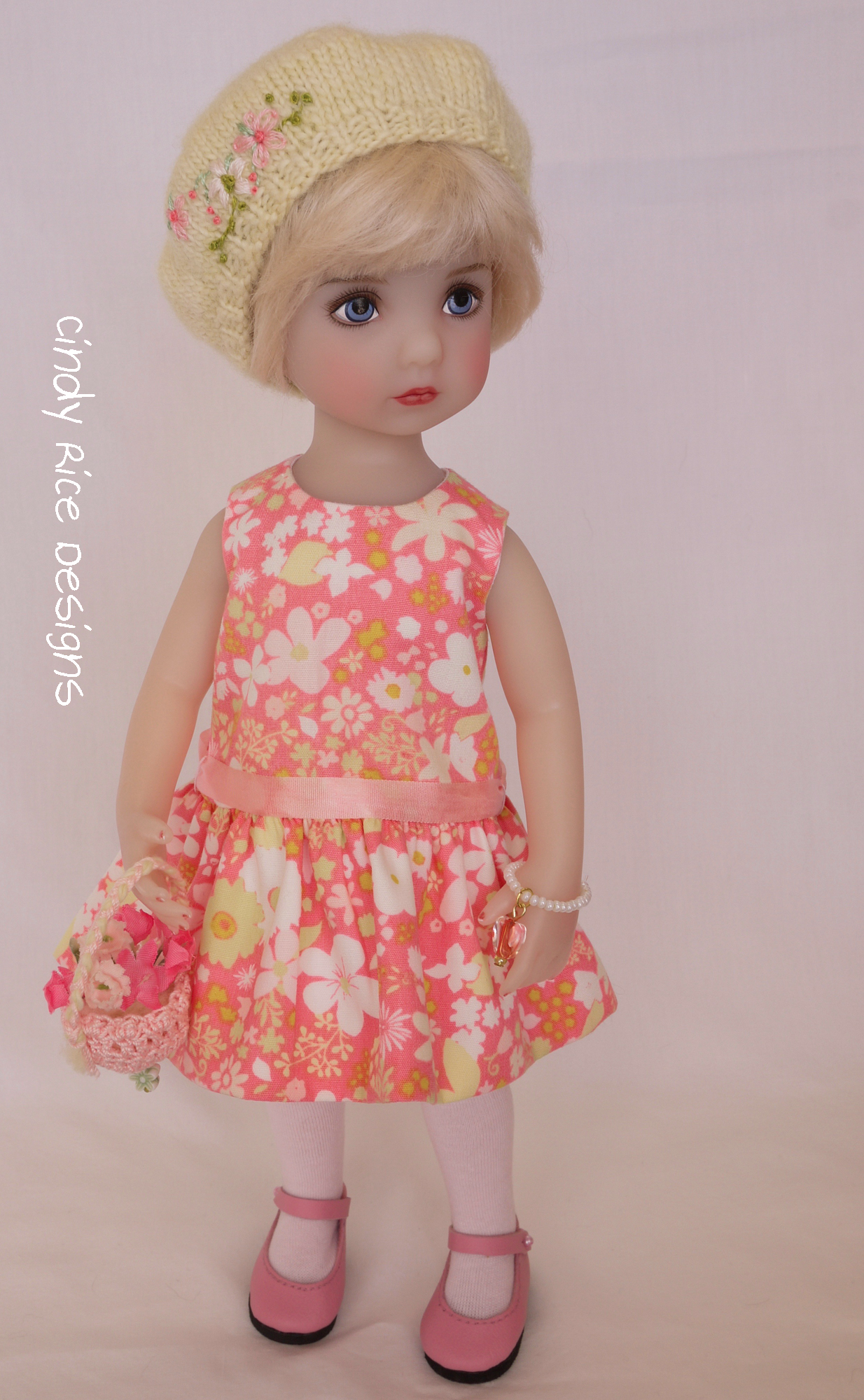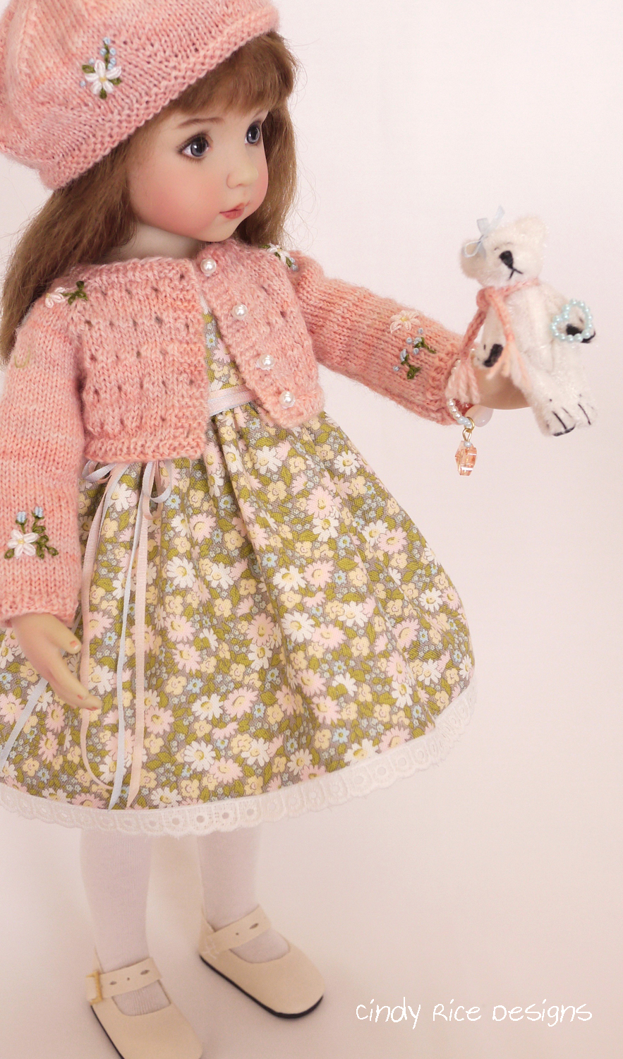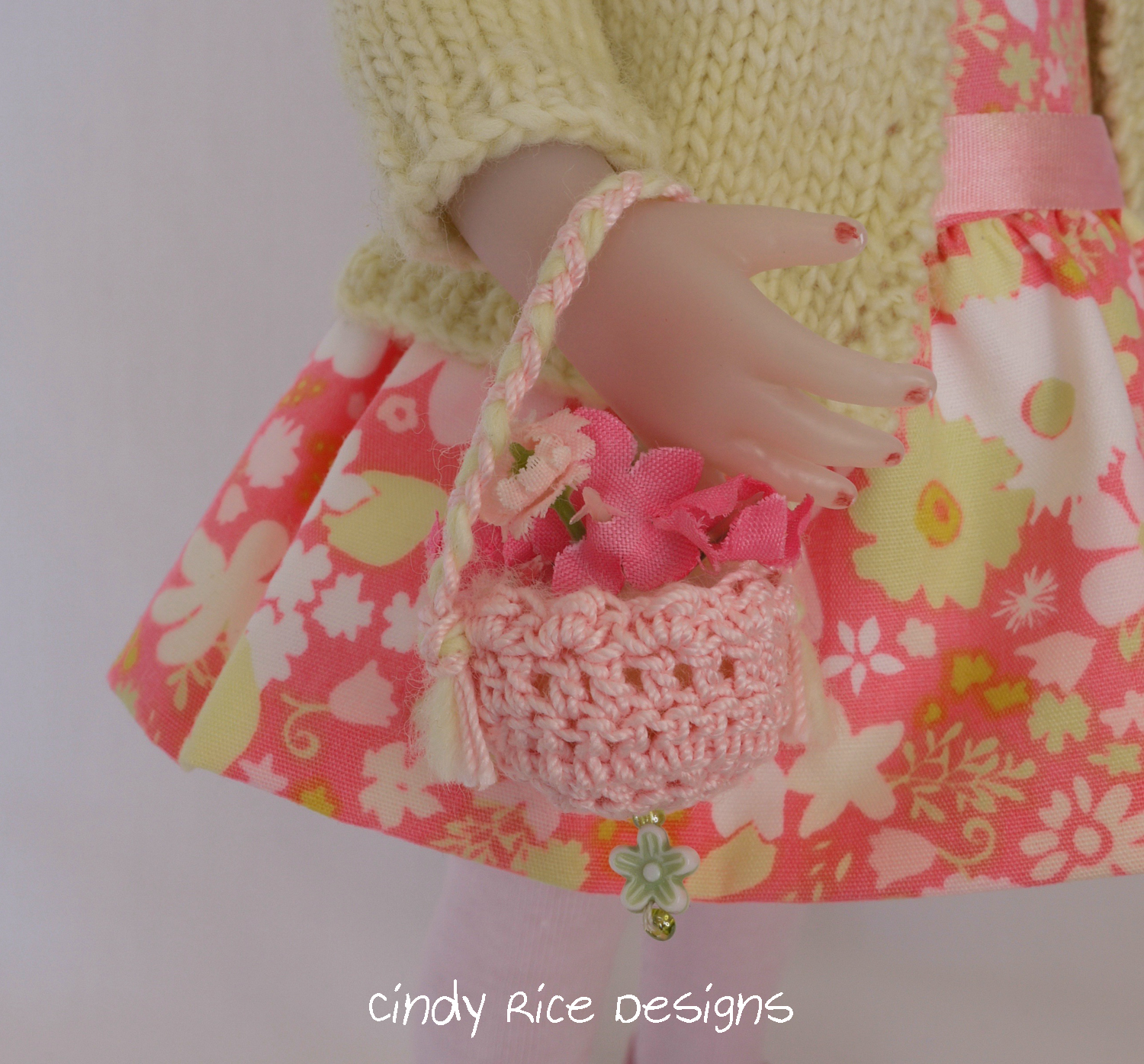 To complete her ensemble I made pale pink cotton tights. Her tiny crocheted basket holds some pink blossoms. Evianna’s heart charm bracelet tells her that this ensemble was made with love just for her!
