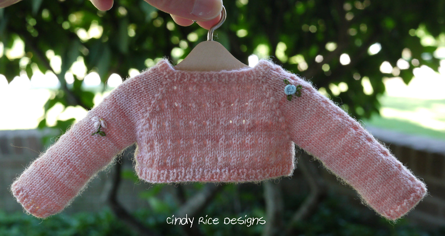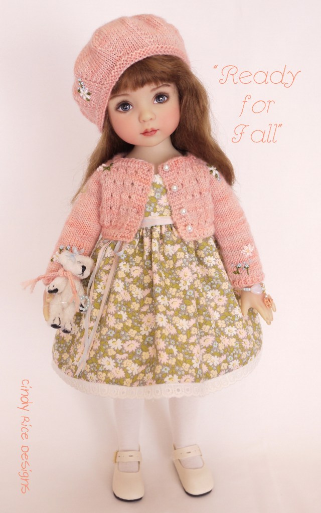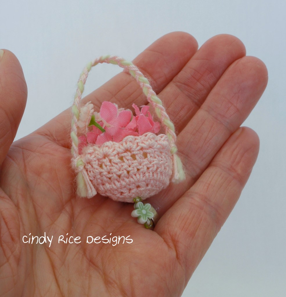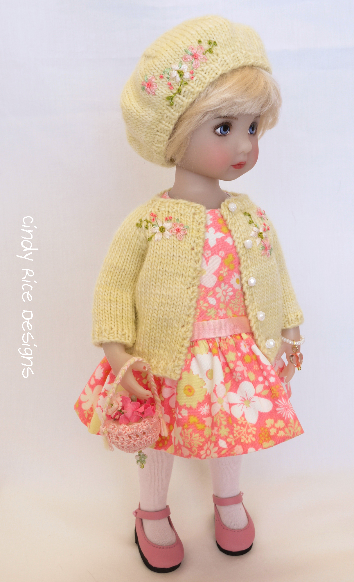To complete her ensemble I made pale pink cotton tights. Her tiny crocheted basket holds some pink blossoms. Evianna’s heart charm bracelet tells her that this ensemble was made with love just for her!